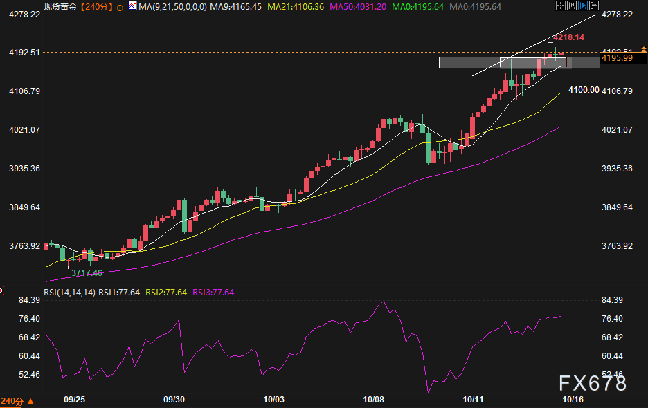 北京时间01:40,现货黄金报4191.16美元/盎司,涨幅1.19%。欧洲交易时段早些时候,金价曾触及4218美元的历史新高。